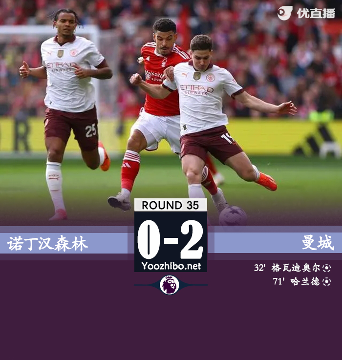 JRS直播网讯:北京时间4月28日23:30,英超第35轮,曼城客战诺丁汉森林。上半场,德布劳内角球助攻,格瓦迪奥尔头球破门,伍德错失良机;下半场,格瓦迪奥尔门前送出关键解围,哈兰德伤愈复出替补登场打入一球。最终,曼城客场2-0击败诺丁汉森林,积79分位列积分榜第二位,少赛一场落后榜首的阿森纳1分,森林则积26分高出降级区1分。