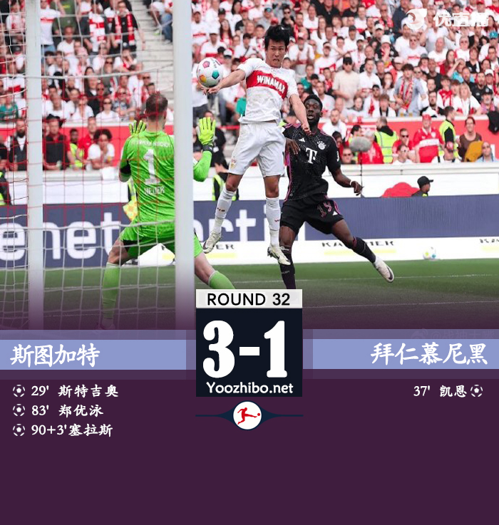 JRS直播网讯:北京时间5月4日21:30,德甲联赛第32轮拜仁挑战斯图加特的比赛,上半场格雷罗伤退,戴尔精彩门线解围,斯特吉奥挑射破门,格纳布里造点凯恩点射破门扳平比分,半场结束,斯图加特1-1拜仁。下半场舒波莫廷失单刀,郑优泳头球反超比分,塞拉斯补时推射杀死比赛,最终拜仁1-3斯图加特,拜仁将在四天后欧冠半决赛客场挑战皇马。