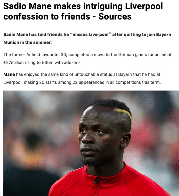 来源:JRS直播网11-08 22:27JRS直播网11月08日晚,来自英国媒体ootball Insider的消息,效力于拜仁的巨星马内,已经在私下告诉自己的好友,自己非常想念老东家利物浦还有想念英超联赛。