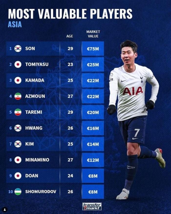 德转亚洲球员身价排名:孙兴慜7500万欧第一