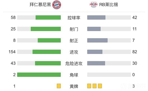 全场比赛结束,拜仁慕尼黑3-2莱比锡。