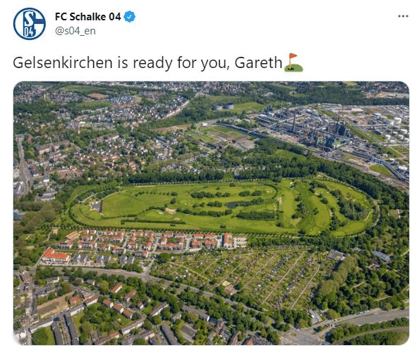 JRS直播网讯 沙尔克04上赛季在德甲垫底,新赛季只能去踢德乙。但他们的官推还是晒出了一大片高尔夫球场的鸟瞰图:“盖尔森基兴为你准备好了,贝尔!”