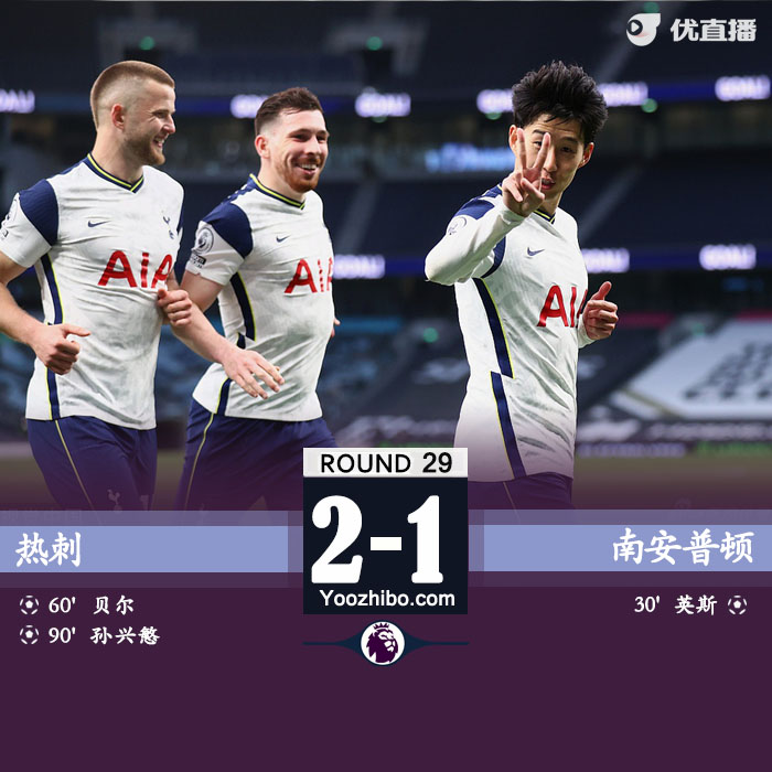 JRS直播网4月22日讯 北京时间4月22日凌晨1时,2020-2021赛季英超联赛第29轮的一场补赛展开角逐,热刺坐镇主场迎战南安普顿。上半场,丹尼-英斯头球破门,南安普顿半场1-0领先热刺。下半场,贝尔扳平比分,随后孙兴慜点球破门完成绝杀。最终热刺主场2-1击败南安普顿。