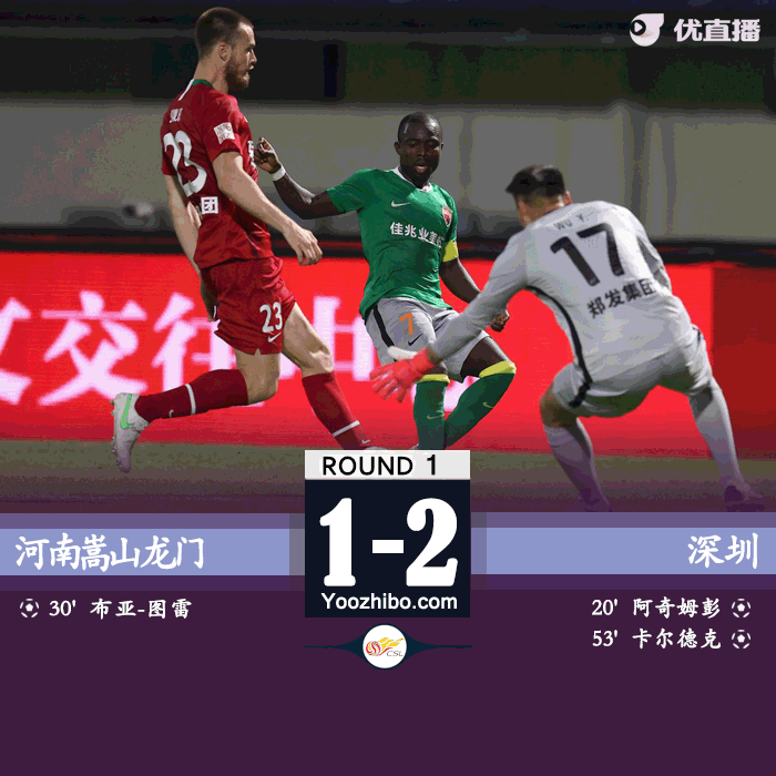 JRS直播网4月21日讯 北京时间4月21晚8点,2021赛季中超联赛广州赛区首轮比赛继续展开角逐,深圳队与河南嵩山龙门在花都体育场直接交锋。上半场,金特罗助攻阿奇姆彭率先建功,随后,张鹭出击失误被图雷打空门得手。下半场,卡尔德克利用角球头槌为深圳再次超出比分。最终,深圳队2-1战胜河南嵩山龙门,取得联赛开门红。