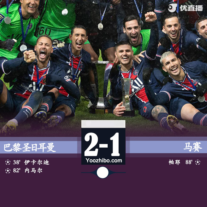 JRS直播网1月14日讯 北京时间1月14日4:00,法国超级杯决赛打响,巴黎圣日尔曼迎战马赛。上半场,伊卡尔迪、姆巴佩接连越位进球被吹,伊卡尔迪打破僵局后又击中横梁。下半场,内马尔复出登场点球建功,帕耶扳回一球。全场比赛结束,巴黎2-1战胜马赛,连续八年夺得法国超级杯。