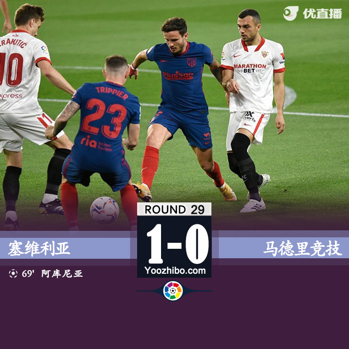 JRS直播网讯 4月5日讯 北京时间04月05日星期一03:00,西甲第29轮塞维利亚迎战马德里竞技。上半场拉基蒂奇造点,奥布拉克扑点,马竞半场0-0塞维利亚。下半场,阿库尼亚首开记录。最终,塞维利亚主场1-0力克马竞。在同轮次情况下,马竞的领先优势仅剩3分。