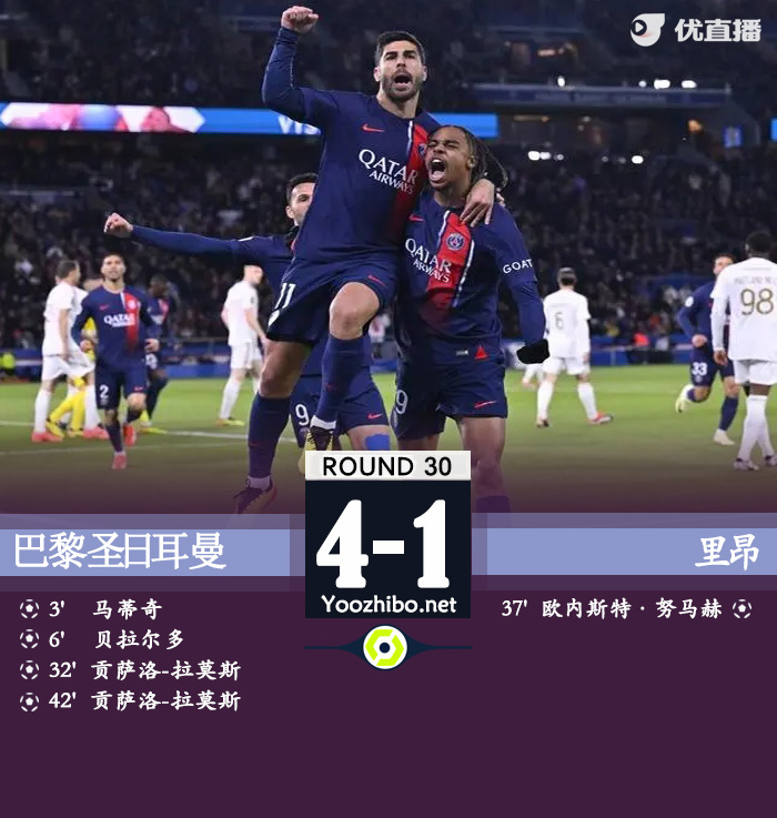 JRS直播网讯:法国足球顶级联赛第30轮,巴黎圣日耳曼在主场迎战里昂。上半场,阿森西奥传球造成马蒂奇乌龙。3分钟后,贝拉尔多门前破门扩大领先优势。阿什拉夫传中,贡萨洛-拉莫斯头槌破门。随后,努瓦马低射为里昂扳回一城。阿森西奥传球,贡萨洛-拉莫斯铲射得分。下半场,两队均无建树。全场比赛结束,巴黎4-1轻取里昂。