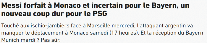 该媒体表示,梅西在法国杯对阵马赛的比赛中受伤,将无缘本周对阵摩纳哥的联赛,能否出战与拜仁的欧冠1/8决赛首回合,还不能确定。