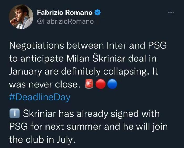 罗马诺表示,巴黎和国米就什克里尼亚尔的转会谈判已经破裂,实际上这笔交易从来没有接近达成。