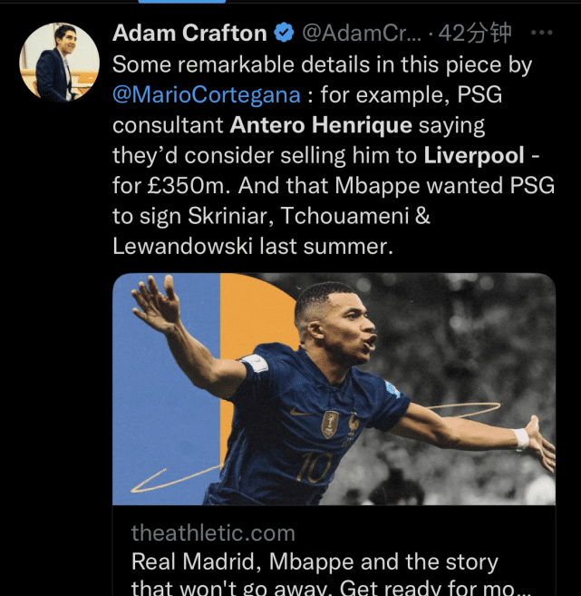 据悉,如果姆巴佩愿意去利物浦,巴黎圣日耳曼方面愿意放行,不过他们准备对利物浦要价3.52亿英镑,这几乎是姆巴佩目前在德国转会市场身价的2倍还要多。