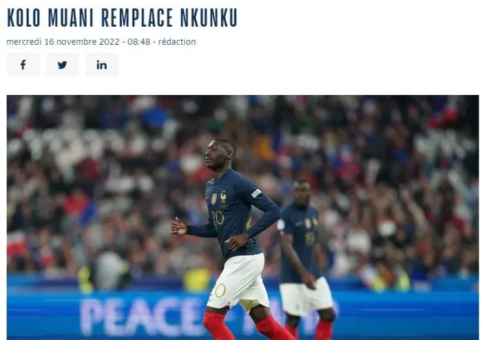 JRS直播网11月16日消息,法国队招入23岁的法兰克福前锋科洛-穆阿尼,代替受伤的恩昆库。