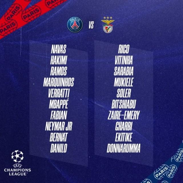 纳瓦斯、阿什拉夫、拉莫斯、马尔基尼奥斯、维拉蒂、姆巴佩、法比安、内马尔、贝尔纳特、达尼洛、里科、维蒂尼亚、萨拉维亚、穆基勒、索莱尔、比施亚布、Z-埃梅里、加尔比、埃基蒂克、多纳鲁马