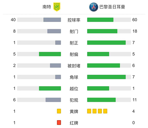 全场比赛结束,巴黎圣日耳曼客场3-0完胜南特。