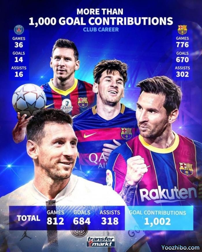 统计表明,梅西在其俱乐部生涯里已直接参与超过1000个进球,具体数据为812场684球318助,共计1002球。