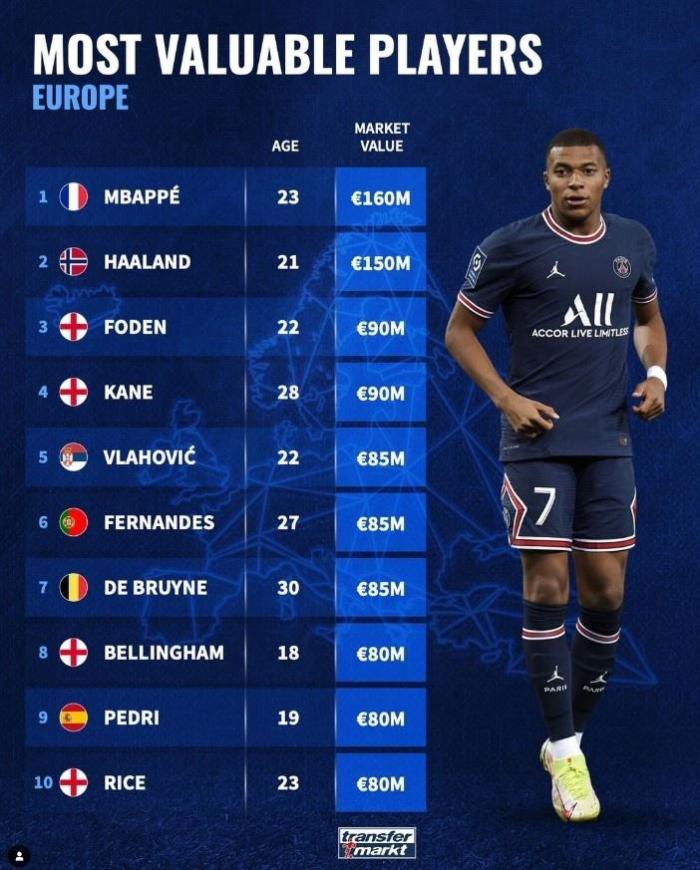 欧洲球员身价TOP10:姆巴佩哈兰德领衔