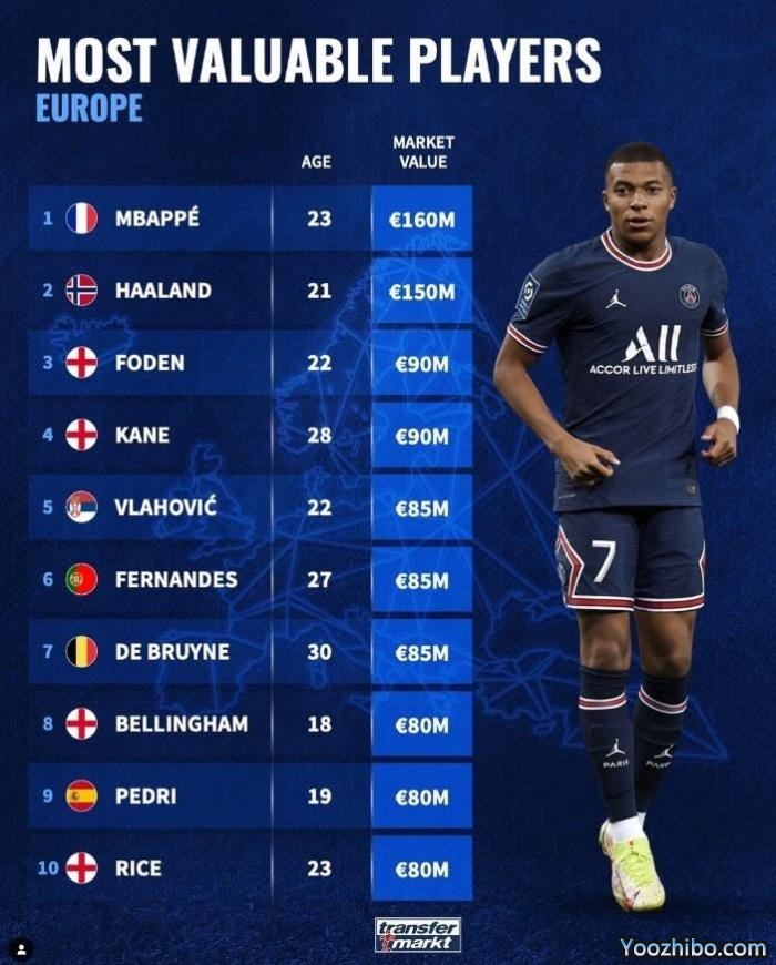 欧洲球员身价TOP10:姆巴佩哈兰德领衔