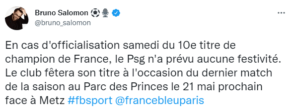 JRS直播网04月23日讯 记者BrunoSalomon消息,虽然巴黎本轮打平就能夺取联赛冠军,但他们没有准备任何庆祝活动。