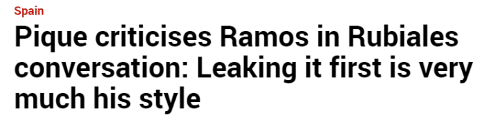 《马卡》称去年夏天皮克还请鲁比亚雷斯帮他在西班牙奥运代表队要一个名额。皮克希望两人之间的对话保密,因为他担心其他球员也来要名额,包括拉莫斯。皮克指责拉莫斯在媒体上泄露他要去踢奥运会的消息,皮克告诉鲁比亚雷斯:“第一个泄密正是拉莫斯的作风!”