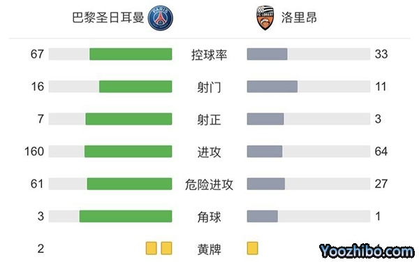 全场比赛结束,最终巴黎圣日耳曼5-1击败洛里昂,联赛主场7连胜。