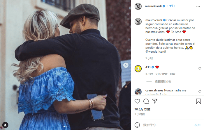 今天伊卡尔迪晒出两人合照,并写道:“感谢你继续信任这个美好的家庭,感谢你成为我们生活的源动力,我爱你。”