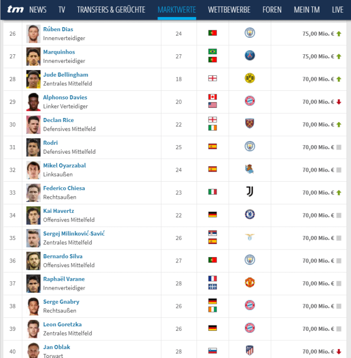 从榜单可以看出,身价8000万以上的球员中,大部分都来自英超,足坛22名球员身价超过8000万欧元,而其中英超占据了12席,可见英超的吸引力有多大。而其他一些顶级球员芒特、德里赫特、阿诺德迪亚斯和马尔金尼奥斯的身价是7500万欧元,贝林汉姆、戴维斯、莱斯、罗德里、奥亚萨瓦尔、基耶萨、哈弗茨、米林萨维奇、贝尔纳多、瓦拉内、格纳布里、格雷茨卡、奥布拉克和卡塞米罗的身价都是7000万欧元。