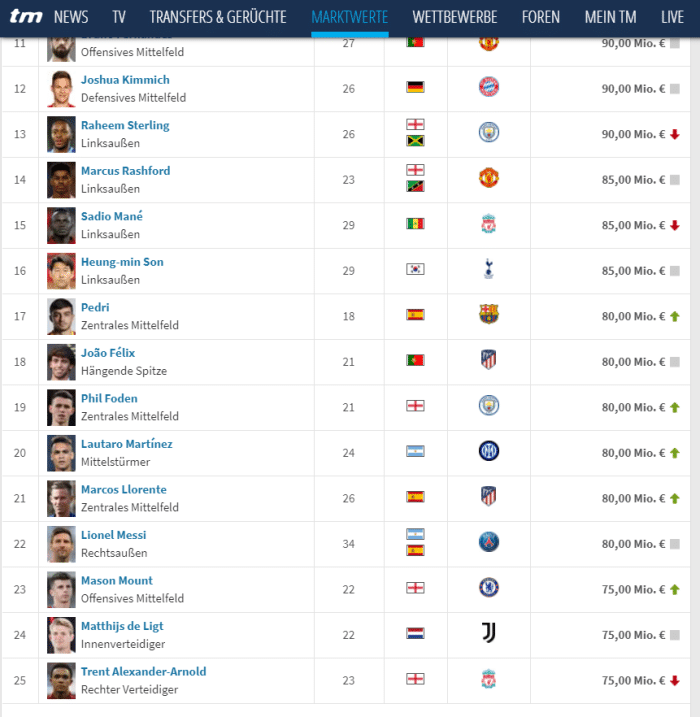 来源:JRS直播网10-08 17:06JRS直播网10月08日讯 近日,德国权威媒体《转会市场网》再度更新了球员的身价情况,其中身价最高的球员依然是巴黎的姆巴佩,他的身价高达1.6亿欧元,而排名第二的则是多特的哈兰德,他的身价从1.3亿欧元上涨到了1.5亿欧元。而排名第三的依然是热刺的凯恩,他的身价是1.2亿欧元。好了,话不多说,一起看看这些球员的身价到底都是多少吧!