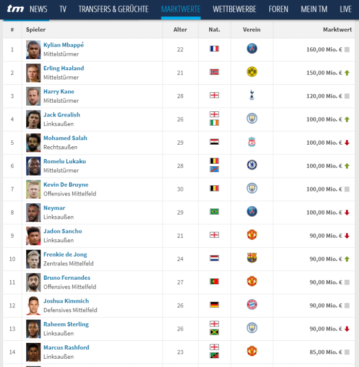 如图,姆巴佩的身价是1.6亿位居榜首,随后是哈兰德的1.5亿欧元,跟着是凯恩的1.2亿欧元,然后是格拉利什、萨拉赫、卢卡库、德布劳内和内马尔的1亿欧元。再往后是桑乔、德容、B费、基米希和斯特林的9000万欧元。随后是拉什福德、马内和孙兴慜的8500万欧元,佩德里、菲利克斯、福登、劳塔罗、略伦特和梅西的8000万欧元。