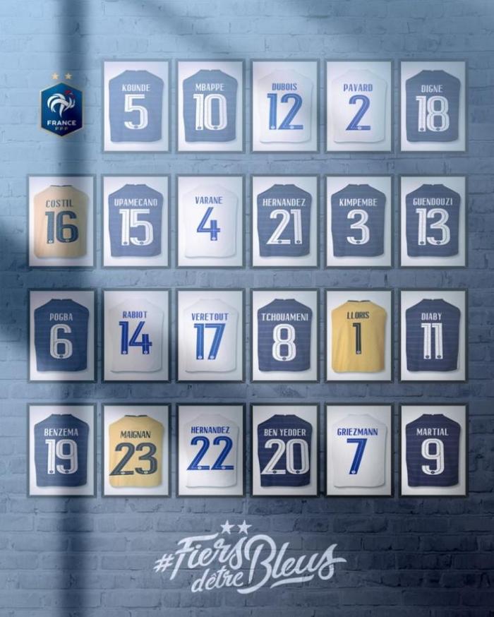 JRS直播网讯今日法国队公布了集训球员的号码,其中格列兹曼7号,马夏尔9号、姆巴佩10号、本泽马19号。