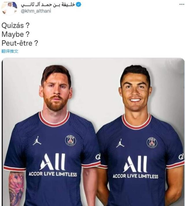 今天,这位卡塔尔皇室成员在推特上晒出梅西和C罗身穿巴黎球衣的照片,并写道:“也许?”