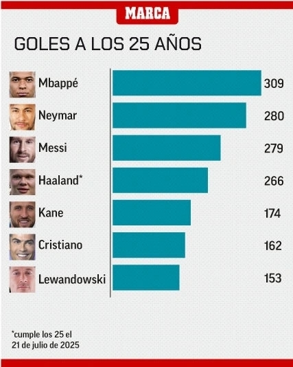 JRS直播网讯 马卡统计球星25岁时进球数,姆巴佩309球领跑 内马尔280球位居次席。
