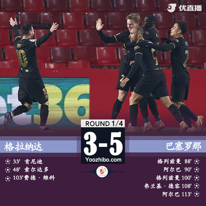 JRS直播网2月4日讯 北京时间2月4日凌晨4点整,2020-21赛季西班牙国王杯1/4决赛展开角逐,巴塞罗那客场挑战格拉纳达。上半场乌姆蒂蒂失误送礼,肯尼迪首开纪录,下半场索尔达多单刀破门,罗贝托伤退,巴萨三中框,格列兹曼和阿尔巴扳平比分。加时赛格列兹曼、德容和阿尔巴先后破门,最终巴塞罗那客场5-3战胜格拉纳达,巴萨晋级国王杯四强。