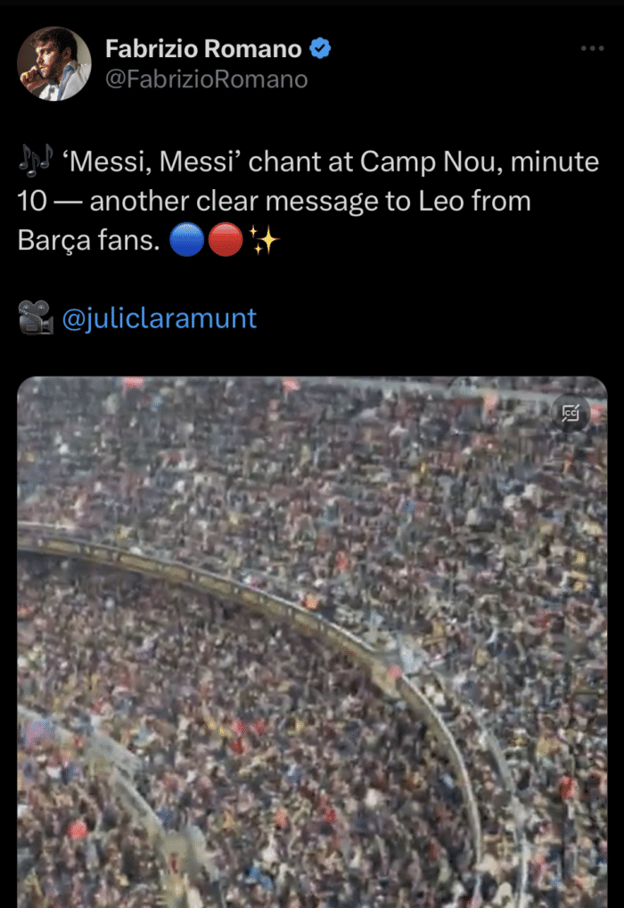 也就是说,那一刻接近10万高喊梅西的名字,这样的场景确实相当震撼。巴萨球迷此举既是回击巴黎球迷主场嘘梅西的争议举动,更是用一种炽热的表达方式期盼着梅西今夏能回归球队。