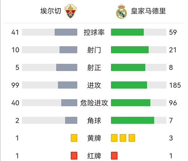 全场比赛结束,最终皇马客场2-1逆转埃尔切。