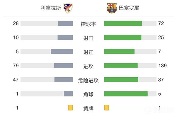 全场比赛结束,巴塞罗那2-1利那拉斯竞技。