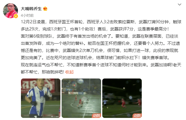 来源:JRS直播网12-02 15:01JRS直播网12月02日讯 今天凌晨西班牙国王杯首轮,西班牙人3-2战胜索拉雷斯,武磊获得首发机会并送出助攻,但错过了一个进球机会,韩乔生对此感叹不已。