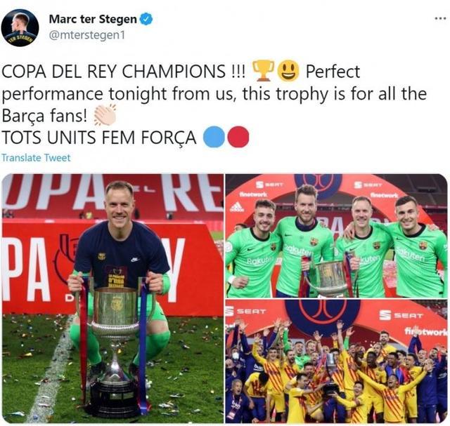 JRS直播网讯 北京时间今天凌晨,国王杯决赛,巴萨4-0大胜毕尔巴鄂竞技,夺得了国王杯冠军,赛后特尔施特根在推特上发文庆祝。
