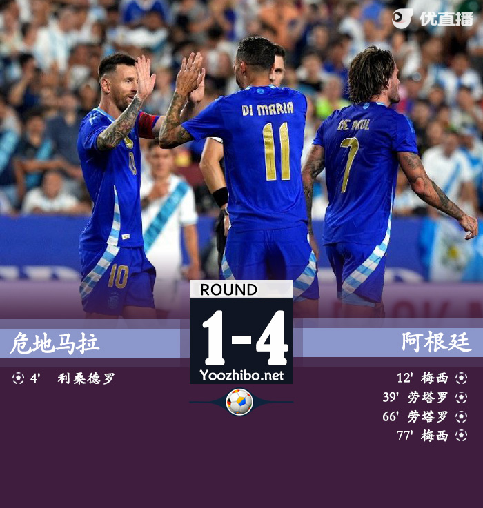 JRS直播网讯:北京时间6月15日08:00,国际足球友谊赛阿根廷挑战危地马拉的比赛,上半场马丁内斯乌龙球,哈根失误梅西推射空门扳平比分,卡博尼造点,劳塔罗点射反超比分,半场结束,阿根廷2-1危地马拉。下半场梅西助攻劳塔罗破门扩大比分,迪马利亚助攻梅西再下一城,最终阿根廷4-1逆转危地马拉,阿根廷将在6月21日迎来美洲杯首战。