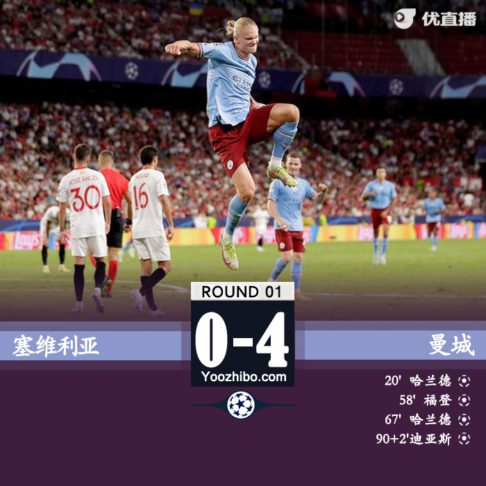 JRS直播网讯北京时间9月7日3:00,欧冠小组赛首回合塞维利亚主场迎战曼城的比赛,上半场德布劳内助攻哈兰德破门,下半场福登破门,哈兰德完成梅开二度,迪亚斯补时建功,最终,曼城客场4-0塞维利亚。
