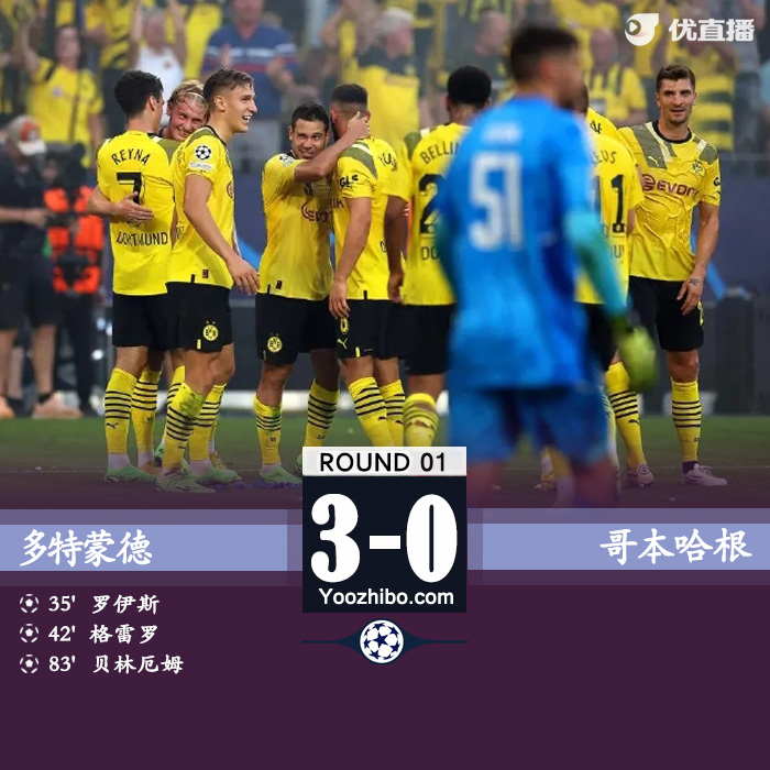 JRS直播网讯北京时间9月7日0时45分,欧冠小组赛第1轮展开角逐,多特蒙德坐镇主场迎战哥本哈根。上半场,罗伊斯破僵,格雷罗低射扩大比分。半场多特2-0领先。下半场,贝林厄姆再下一城。最终多特主场3-0取得欧冠开门红。