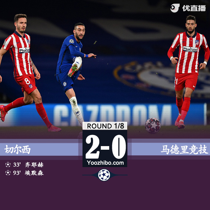 JRS直播网3月18日讯 北京时间3月18日4点,欧冠联赛1/8决赛次回合一场比赛在切尔西和马竞之间进行。上半场卡拉斯科禁区内倒地主裁示意没有犯规,齐耶赫反击中破门。下半场萨维奇肘击直红离场,埃默森补时建功。最终切尔西主场2-0,总比分3-0击败马竞成功晋级欧冠八强。