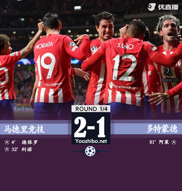 JRS直播网讯:北京时间4月11日欧冠1/4决赛首回合,马德里竞技主场对阵多特蒙德。上半场德保罗抢断首开记录,维特塞尔蝎子摆尾打门被扑,利诺破门扩大比分,下半场阿莱扳回一球,布兰特中柱。最终比分马竞2-1多特蒙德。