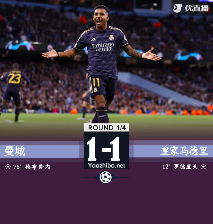 JRS直播网讯:北京时间4月18日欧洲冠军联赛 1/4决赛次回合,曼城主场对阵皇家马德里。上半场,罗德里戈两连击破门,哈兰德头球攻门击中横梁,德布劳内远射被扑,格拉利什抽射变线偏出,德布劳内角球直奔球门被卢宁指尖扑出;下半场,格拉利什凌空斩被挡,格拉利什扣过防守抽射还是被封堵,德布劳内小角度劲射入网,德布劳内迎球推射稍稍高出;加时赛阶段,沃克精彩完成对维尼修斯的单防,吕迪格近距离打门踢偏,卡瓦哈尔出现抽筋情况被换下;点球大战阶段,卢宁两度扑点帮助球队赢下比赛。最终比分曼城 3-4 皇马。两回合总比分曼城7-8皇马。