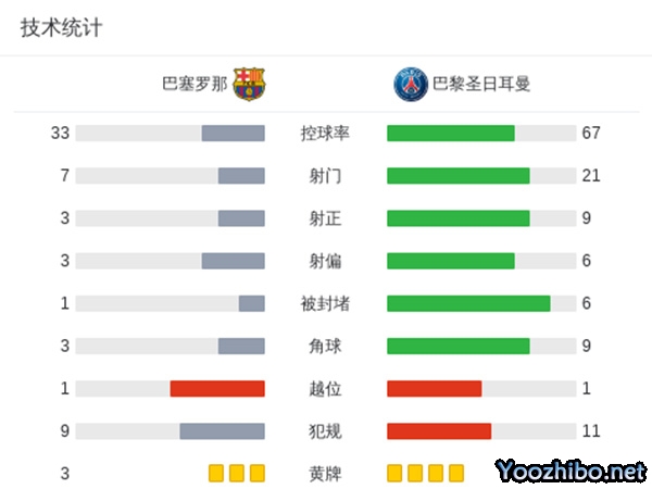 场比赛结束,巴黎客场4-1战胜十人巴萨。