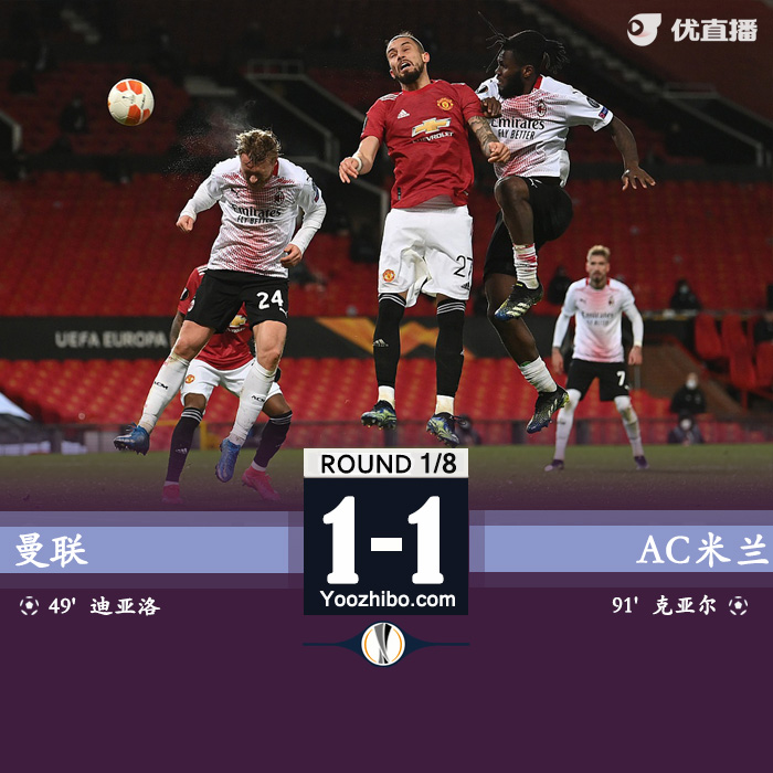JRS直播网3月12日讯 北京时间3月12日凌晨1:55,20-21赛季欧联杯1/8决赛首回合,曼联主场迎战AC米兰。上半时,莱奥和凯西进球都被吹掉,马奎尔空门机会中柱。下半时B费助攻迪亚洛回头望月破门,丹尼尔-詹姆斯包抄空门踢偏,补时阶段克亚尔头球绝平。最终,曼联1-1AC米兰,双方次回合比赛是3月19日凌晨4点。