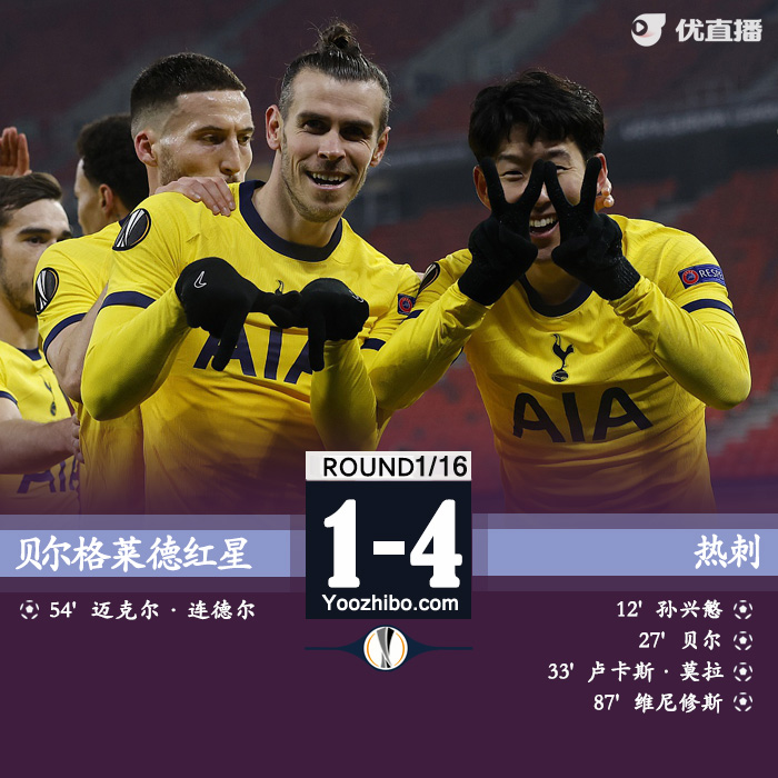 JRS直播网2月19日讯 北京时间2月19日01:55,欧联杯1/16决赛首回合,沃尔夫斯贝格迎战热刺。上半场,孙兴慜头球首开记录,贝尔传射,小卢卡斯一条龙破门,热刺半场3-0领先沃尔夫斯贝格。下半场,西索科送点,维尼修斯破门。最终,热刺4-1战胜沃尔夫斯贝格。