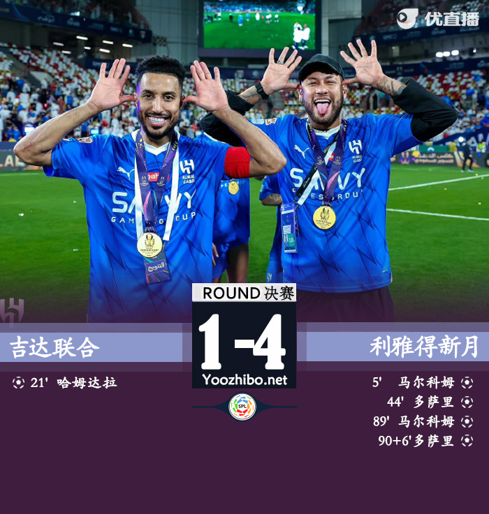 JRS直播网讯:北京时间4月12日沙超杯决赛,吉达联合主场对阵利雅得新月。吉达联合哈默德破门。上半场,萨利赫-谢赫里助攻马尔科姆破门,率先改写比分。哈默德造点主罚被扑,补射将球打进将比分扳平。萨利赫-谢赫里助攻萨勒姆-达瓦萨里破门,将比分再次超出。下半场,哈默德越位在先,进球被吹无效。阿卜杜勒哈米德越位在先,进球被吹无效。马尔科姆破门完成梅开二度再下一城。纳赛尔-达乌萨里补射破门锁定比分。最终利雅得新月4-1战胜吉达联合取34连胜,夺得23~24赛季沙超杯冠军。