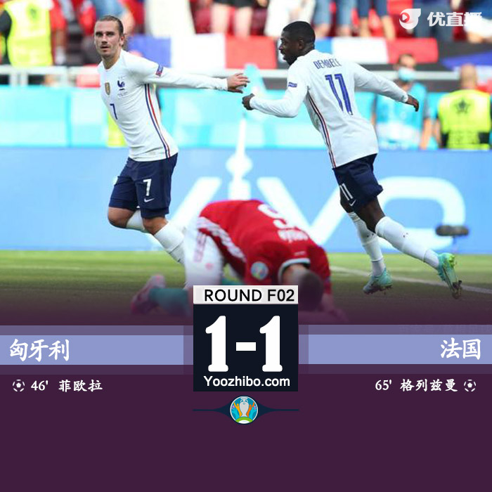JRS直播网6月19日讯 北京时间6月19日21:00,欧洲杯小组赛F组第2轮,匈牙利对阵法国。上半场,姆巴佩屡次制造威胁,本泽马错失一次良机,菲欧拉补时阶段帮助匈牙利打入一球;下半场,替补登场的登贝莱劲射中柱,格列兹曼利用反击机会扳平比分。最终,法国1-1战平匈牙利,法国1胜1平保持不败,匈牙利收获本届欧洲杯第1分。
