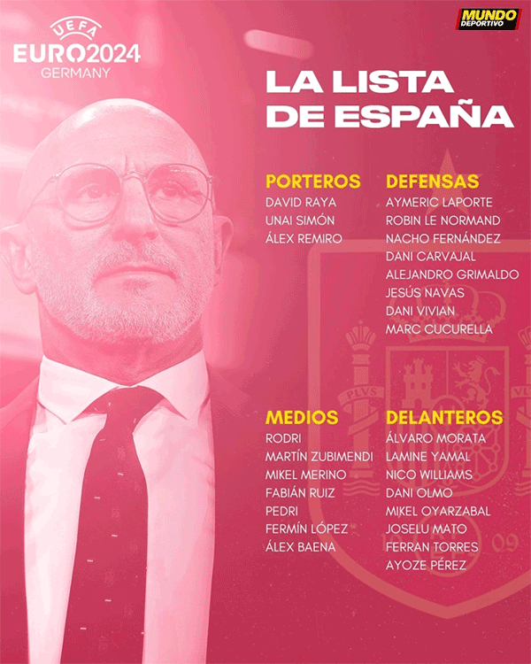 来源:JRS直播网06-08 12:17JRS直播网讯 北京时间 6 月 7 日,西班牙男足正式敲定了参加欧洲杯的 26 人最终名单,纳乔、罗德里、卡瓦哈尔、莫拉特等名将均在列。相较于初选名单,巴萨的库巴西、赫罗纳的阿历克斯-加西亚以及马竞的马克斯-略伦特三人,在最后时刻遗憾被裁,无缘本届欧洲杯。