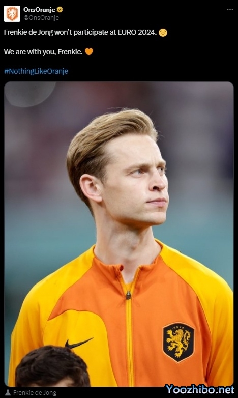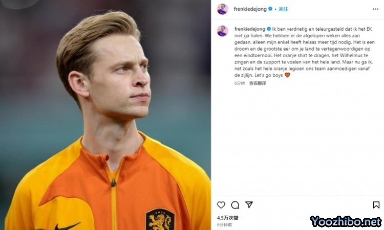 来源:JRS直播网06-11 12:14JRS直播网讯 北京时间6月11日,荷兰男足国家队官方宣布,27岁的巴萨中场弗兰基-德容因脚踝伤势无法及时恢复,将缺席今夏的欧洲杯。而随后,德容本人也在社媒予以确认。