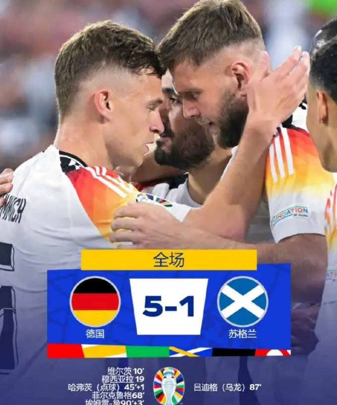 来源:JRS直播网06-15 12:10JRS直播网讯 6月15日,万众瞩目的欧洲杯拉开大幕,德国队迎来了和苏格兰的对阵,在两者的实力上,东道主德国队肯定是占优的,可是让球迷没有想到的是这个占优的优势竟然如此的明显。
